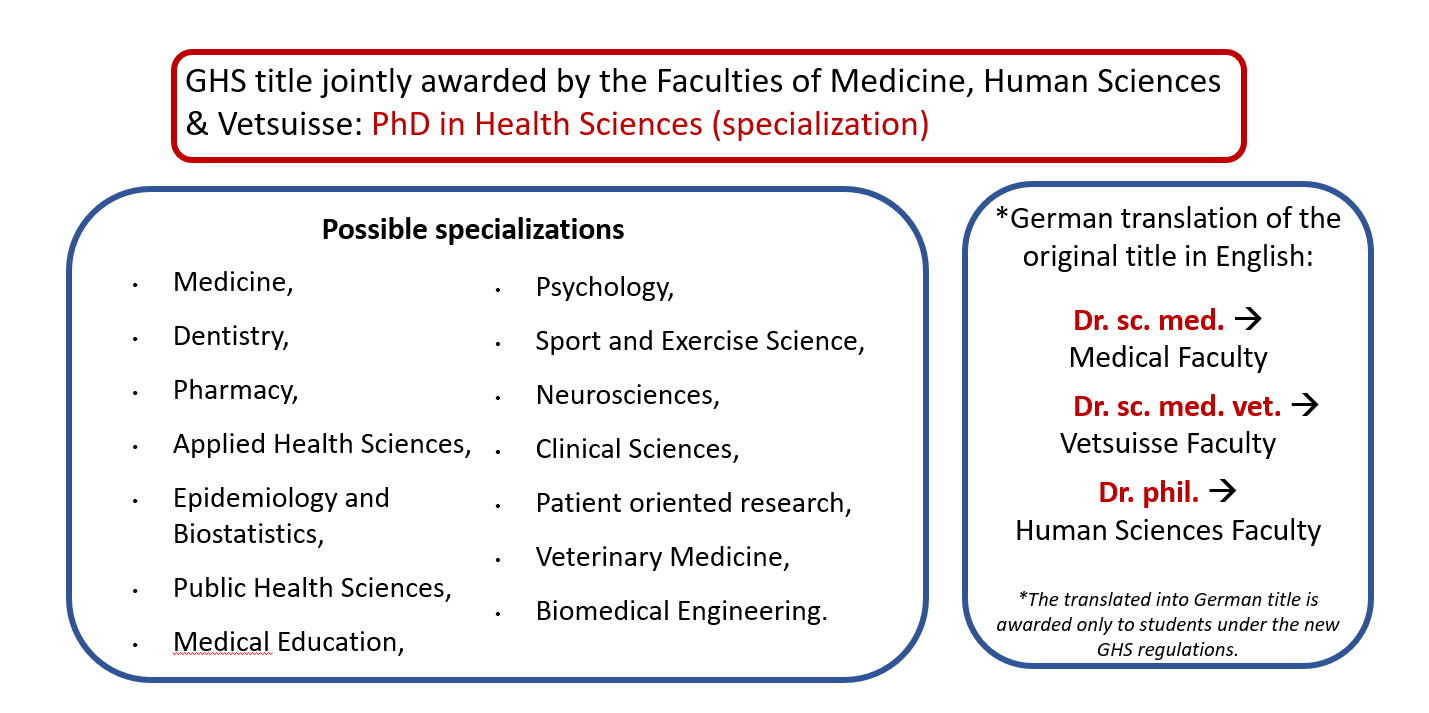 The GHS doctoral degree, jointly awarded by the Faculties of Medicine, Human Sciences and Vetsuisse, consists of two components: a primary title, "PhD in Health Sciences," plus a specialization. All possible specializations are listed in the figure below.